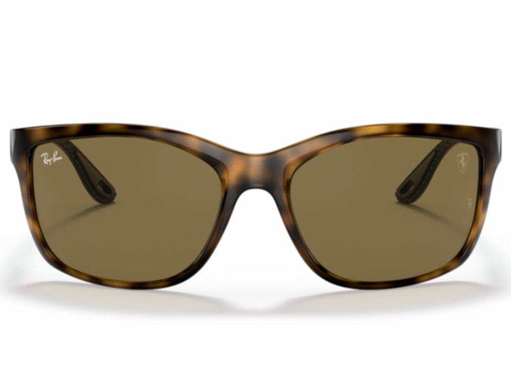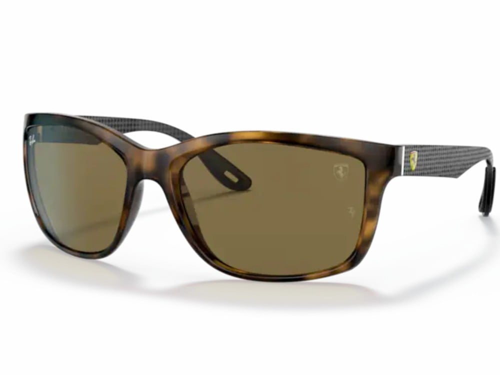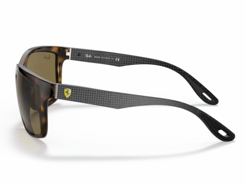 The RAYBAN Ferrari Limited Edition sunglasses featuring a rectangle shape are suitable for men. The RB 8356-M F646-73 model is available in size 61 ideal for medium-sized faces. These sunglasses come with a distinctive Havana frame and dark brown lenses.